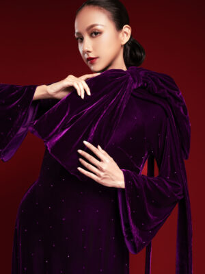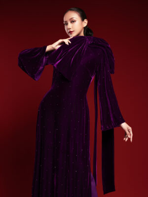 Áo Dài Nhung The Tím Nơ Cổ