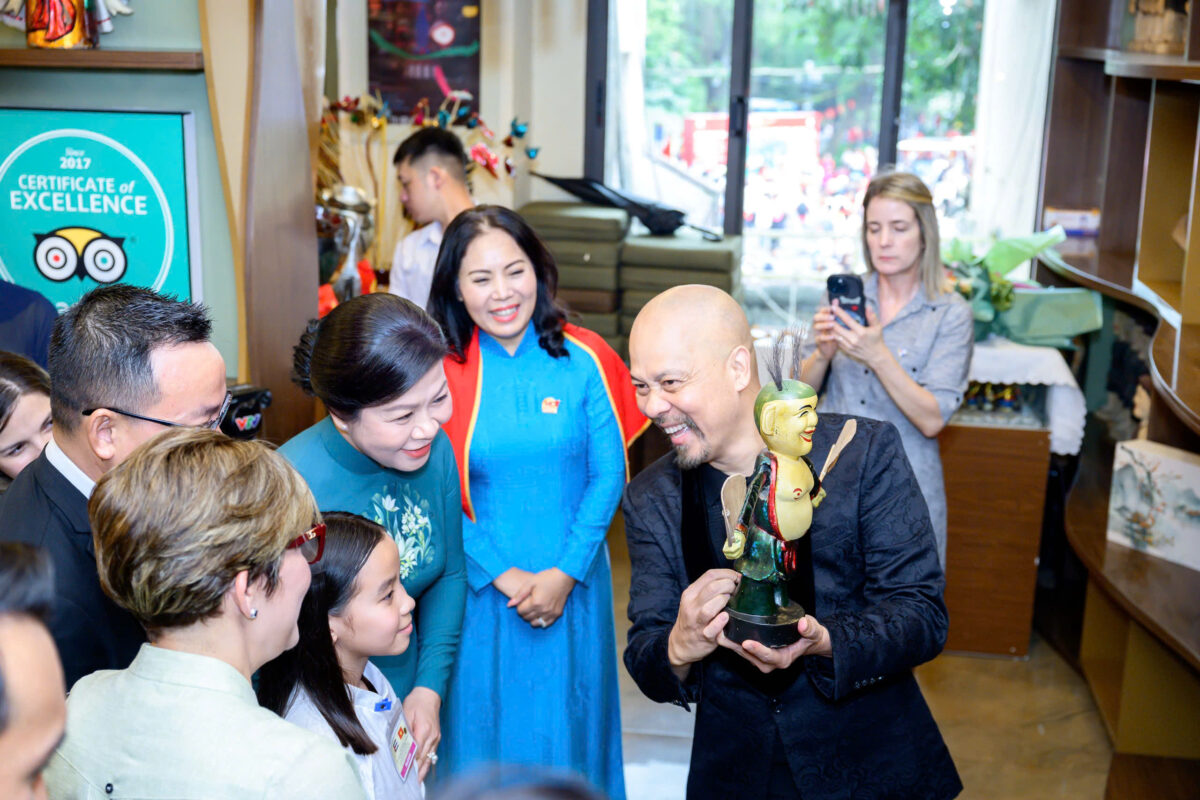 Tại sảnh chính, bà Lis Cuesta Peraza được lãnh đạo nhà hát giới thiệu về những con rối nước, cách thức điều khiển rối.