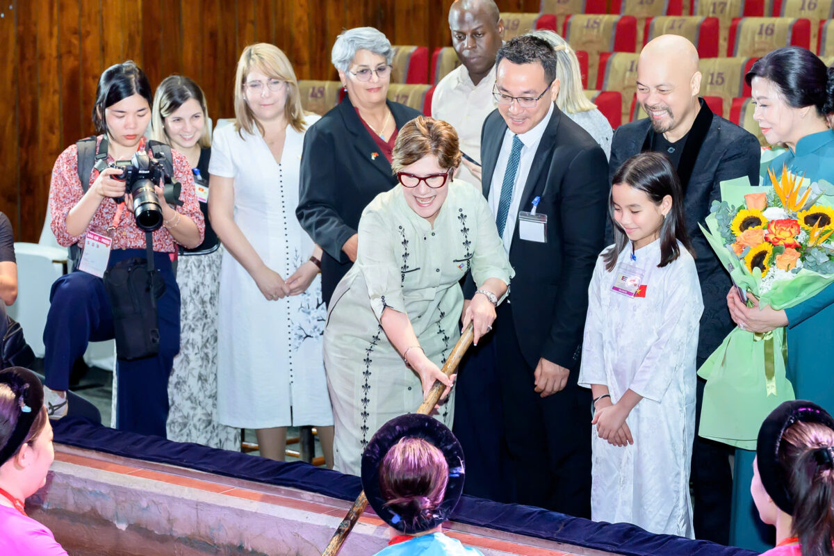 Phu nhân Tổng Bí thư Tô Lâm chia sẻ về kỷ niệm tốt đẹp trong chuyến thăm Cuba hồi tháng 9/2024 khi bà cùng Phu nhân Bí thư thứ nhất, Chủ tịch nước Cuba tới thăm Nhà hát – Bảo tàng rối El Arca. Hai nước đều có loại hình nghệ thuật múa rối độc đáo. Và hôm nay Phu nhân Tổng Bí thư có cơ hội giới thiệu lại với bà Lis Cuesta Peraza về nghệ thuật múa rối nước của Việt Nam.