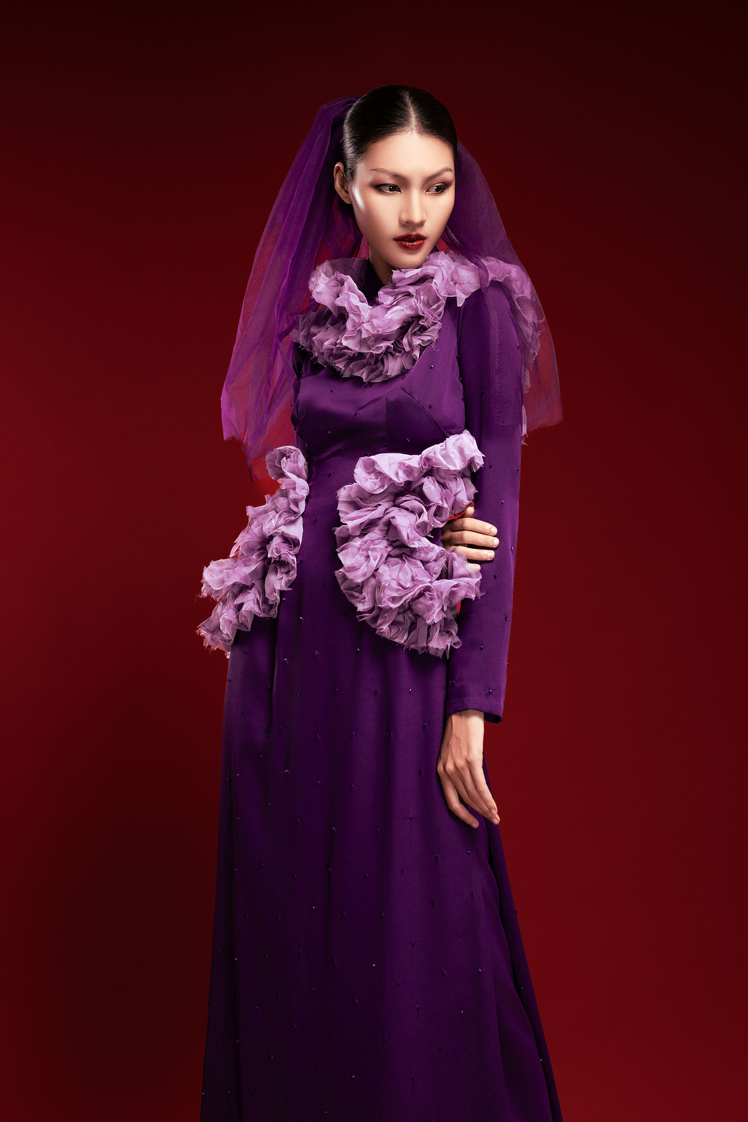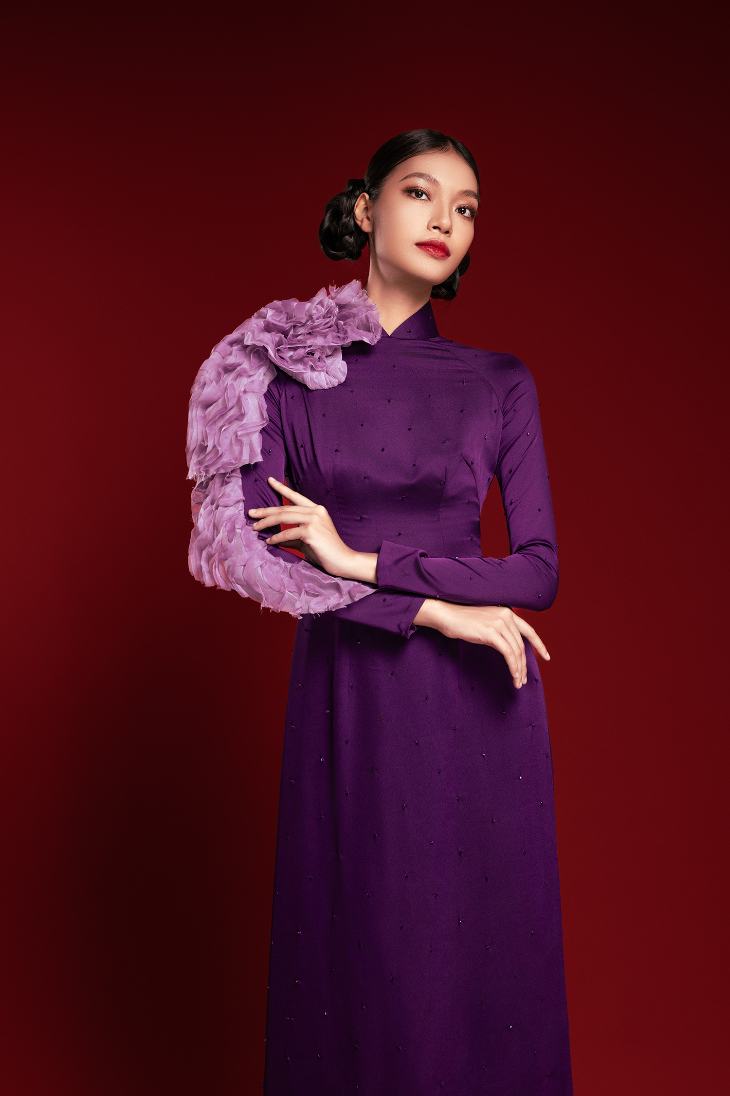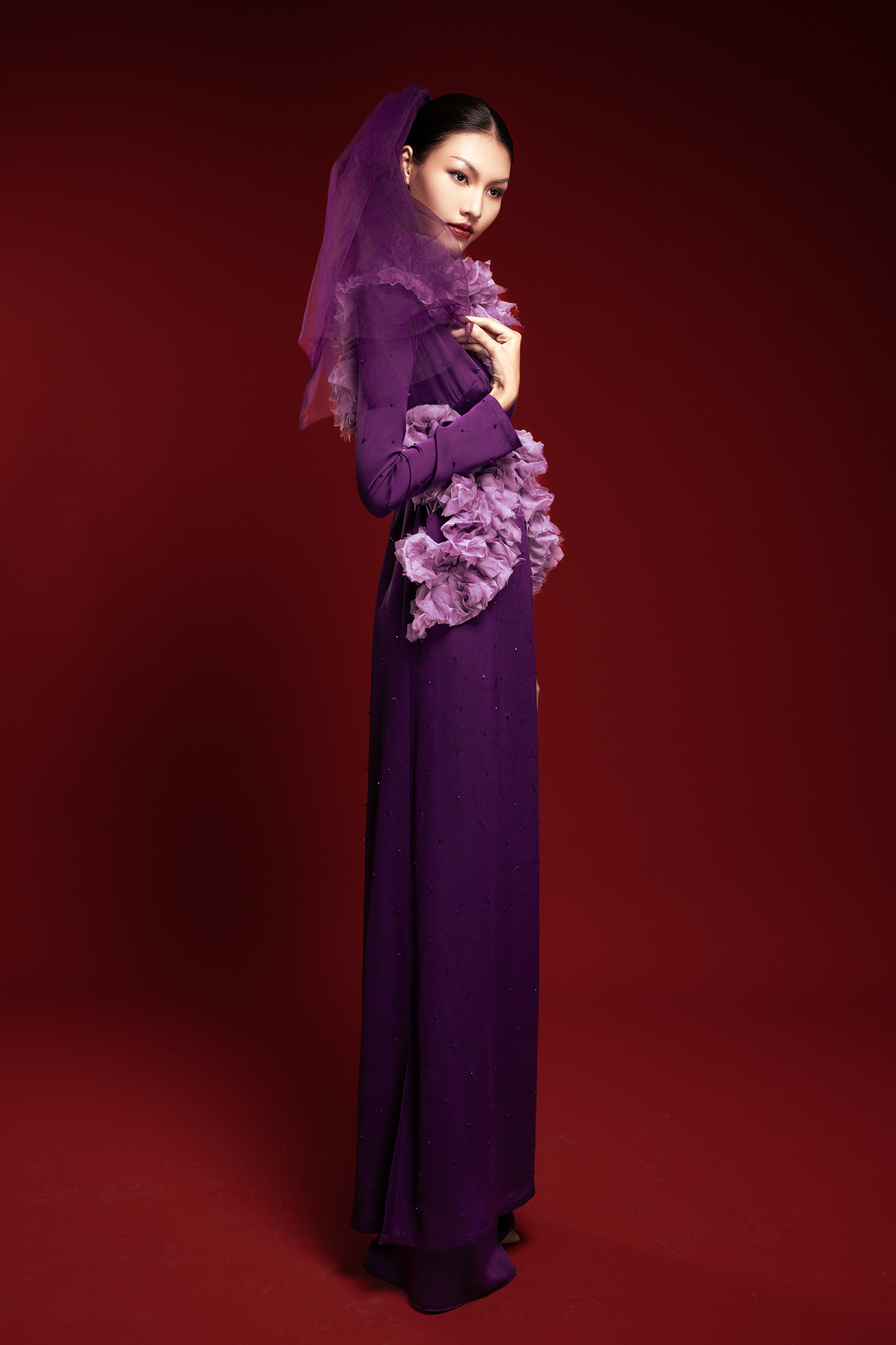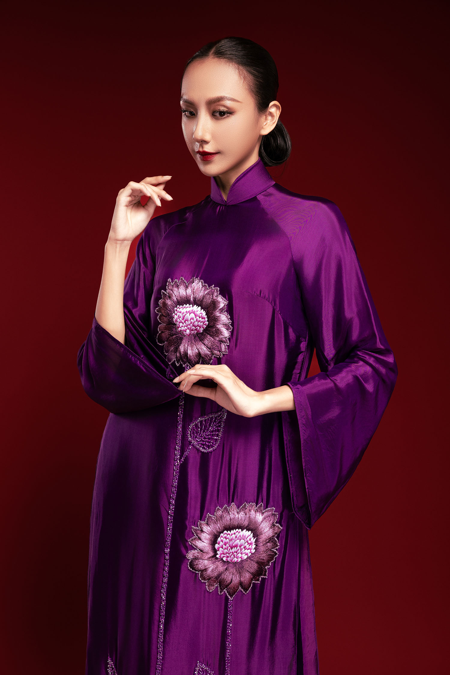 Áo Dài Lụa Tím Đắp Bèo Lưới